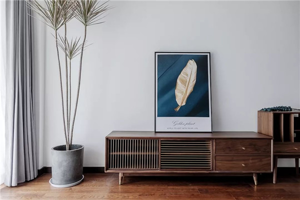 木质打造的客厅散发着北欧风简洁宁静一盆千年木盆栽一幅质感装饰画贴近自然不浮夸简约而细致。