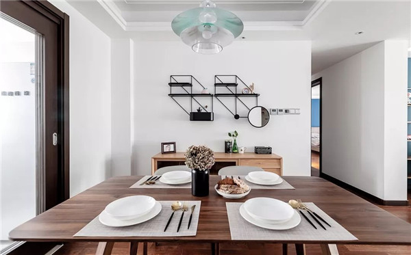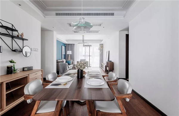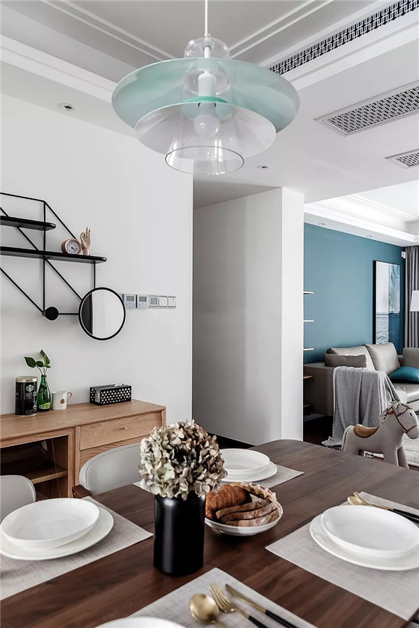 餐厅胡桃木餐桌椅充满质感蓝白搭配的伞状吊灯轻盈而别致充满着轻奢北欧元素的餐厅布置营造出优雅的就餐氛围。