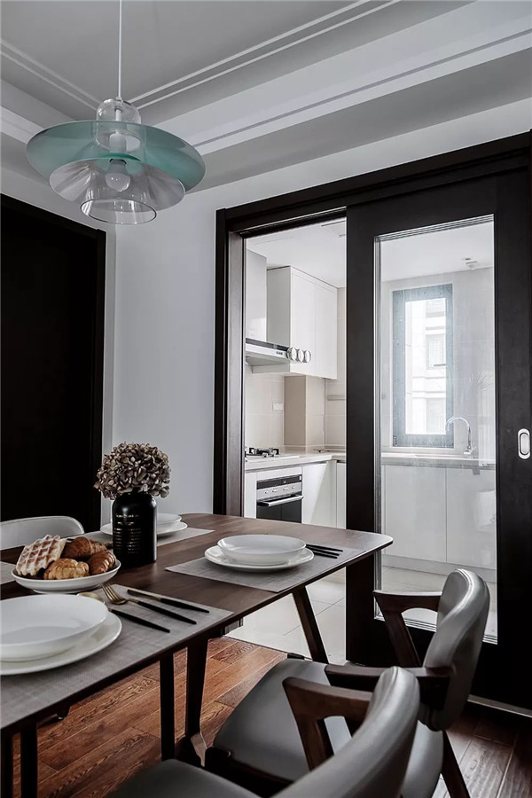玻璃门的设计让餐厅和厨房合二为一让空间在视觉上得到延伸书房。