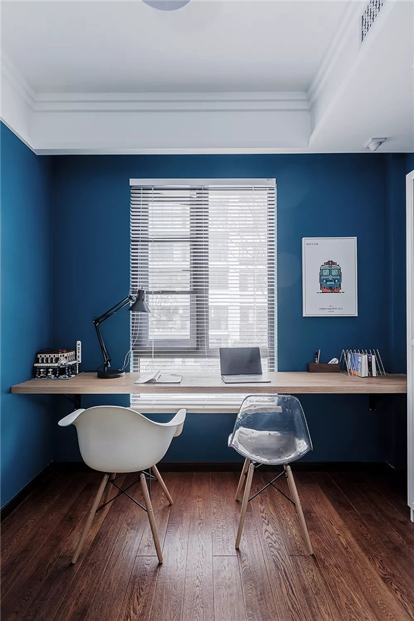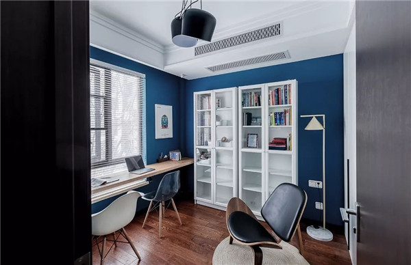 书房以蓝色为基调搭配白色书柜整个色彩十分的鲜明充满了时尚的气息。