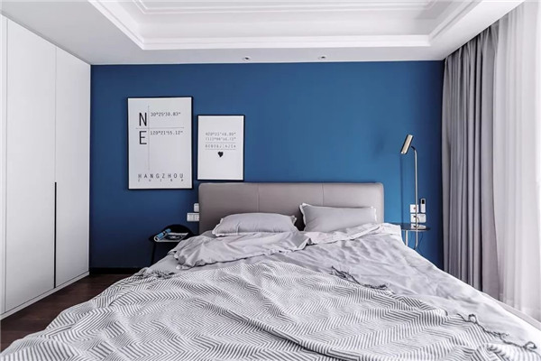 床头蓝色背景墙搭配舒适的床上用品营造简约的就寝空间。