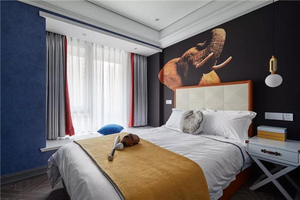 主卧室内是米字拼的地面,床头墙的布置与客厅沙发墙如出一辙。床铺和窗帘的色调洋溢着充沛的活力气息。而床头两边分别是沙漏型床头柜和书桌,兼顾收纳性和实用性。