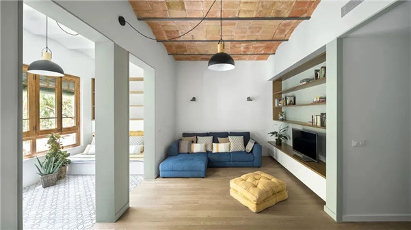 客厅的布置没有以常规的沙发对电视摆设,而是以L字形的布置,让客厅满足基本功能的条件下,尽量让空间保持宽敞舒适的画面,而天花则以独特的红色造型设计,结合电视墙的多层置物架、蓝色布艺沙发与蛋黄色的小布艺坐垫,整个空间显得粗犷而又舒适大方。