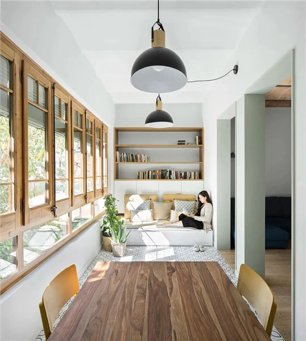 餐厅与客厅之间隔着一道柱子,柱子两侧开门进入餐厅区域,餐厅的地砖是白色+黑色花纹的花砖设计,整体空间显得文艺而又精致。而餐厅区域也是靠着优美的窗景,因此在里面侧边增设了休闲区。