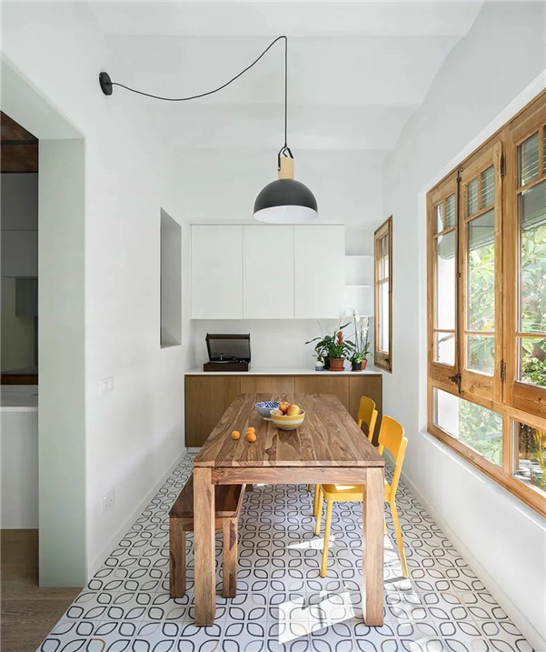 餐厅布置实木餐桌与板凳,搭配两张黄色的塑料材质餐椅,简约实用的吊灯与果盘布置,里侧位置定制了餐边柜+吊柜组合,中间留空出台面摆放装饰品,带来了一个实用优雅的收纳空间。