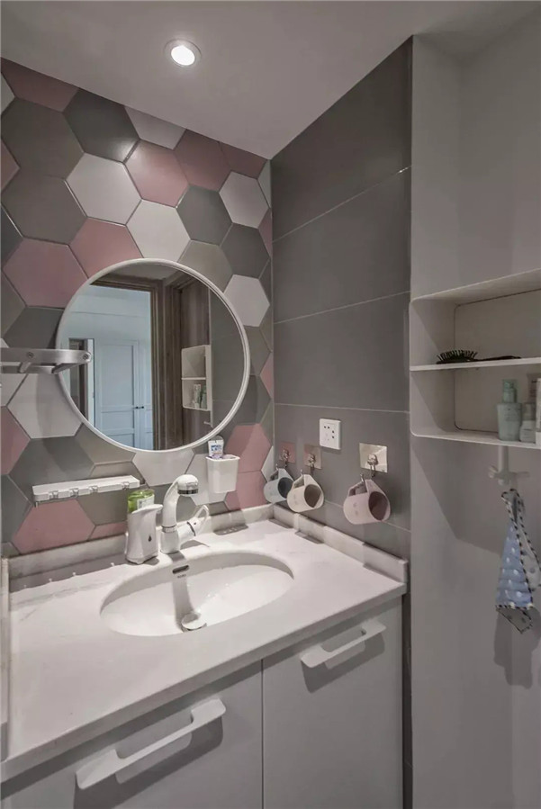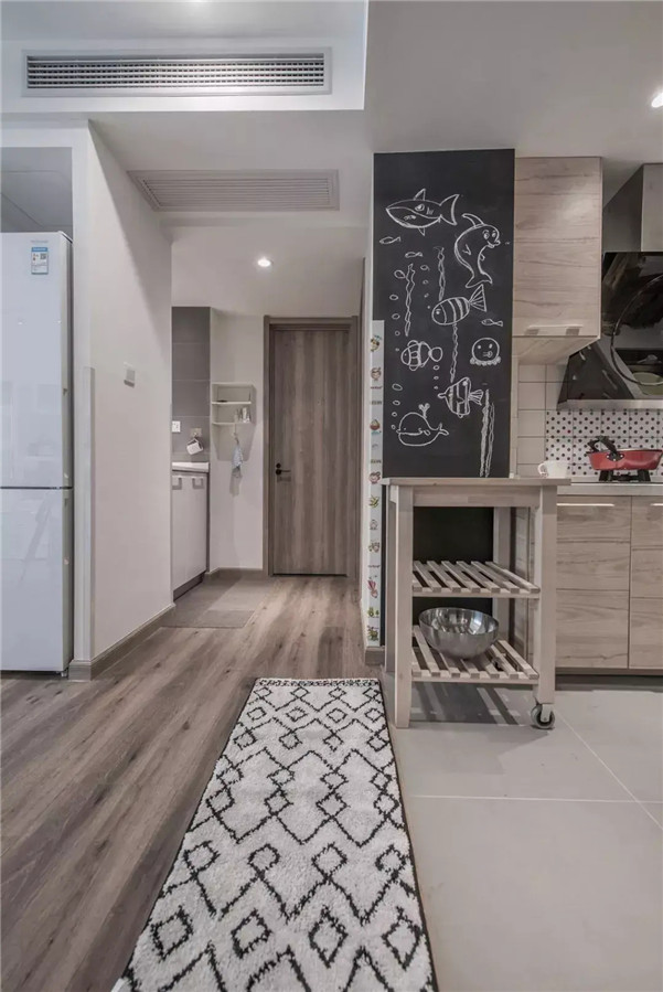白色储物柜的设计,避免了一开门就能将客厅望到底,一定程度上保证了隐私性,同时还让空间的储物能力有所增加。