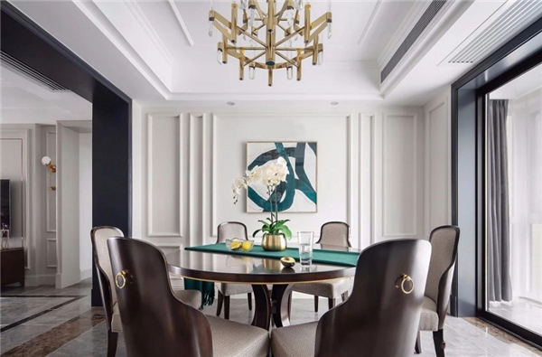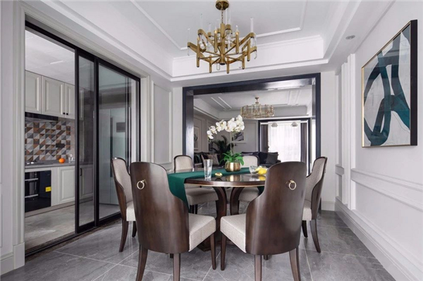 餐客空间处在同一水平线,开放造型让室内光线互通。门厅、餐厅、阳台连续3个深灰色门套贯穿空间,强调整体性与连贯性,呼应深色家具。