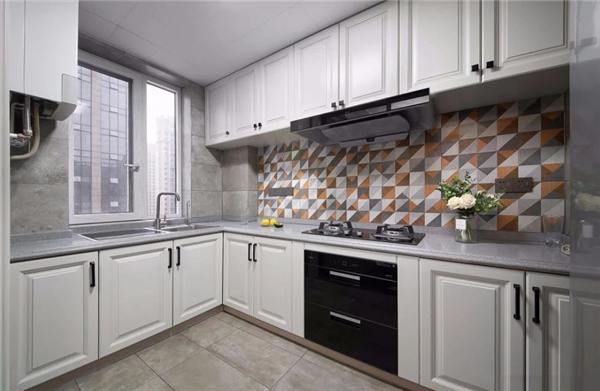厨房墙点缀橙灰小花砖,引导活跃的空间氛围。