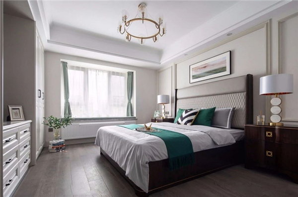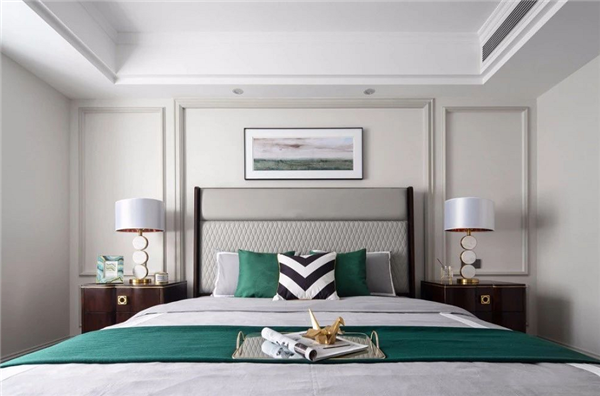 时尚灰与奶咖色墙面冷暖平衡,墨绿点缀凸显时尚雅致,床头软包的柔软质感让人无法忽视。