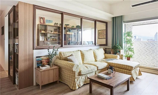 客厅选择了素雅的色调,以原木为基底沙发搭配家具木纹的自然质感,整体安静柔和。