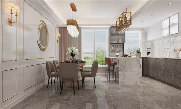 大理石质感在轻奢风里面,可以植入到餐桌、背景墙等位置,可以提升空间的简洁与华丽档次感。