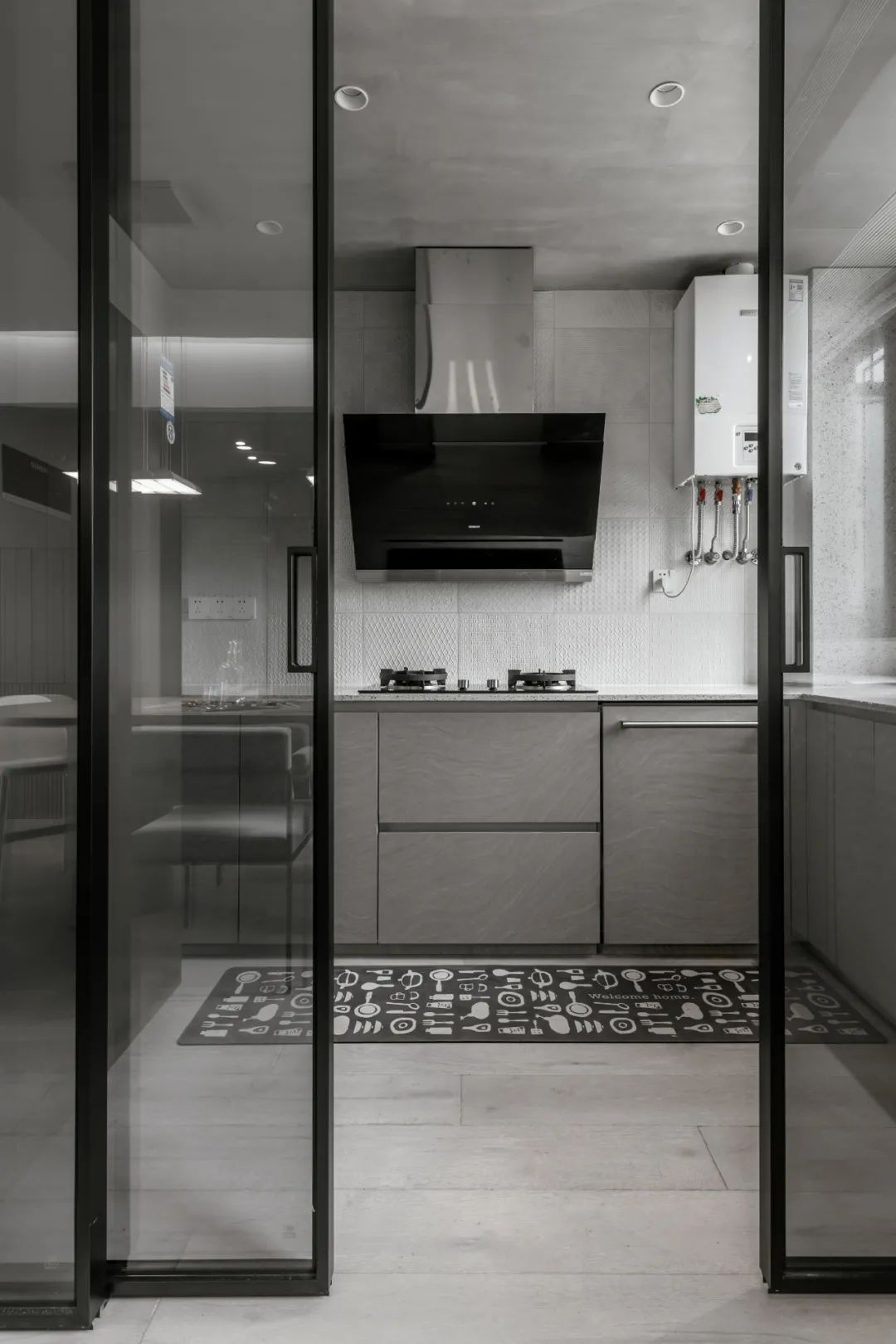 ▲厨房在复古灰色的地面与橱柜基础,布置一块食物厨具图案的小地毯,在黑框推拉门的隔断下,让做饭氛围更加自然从容。