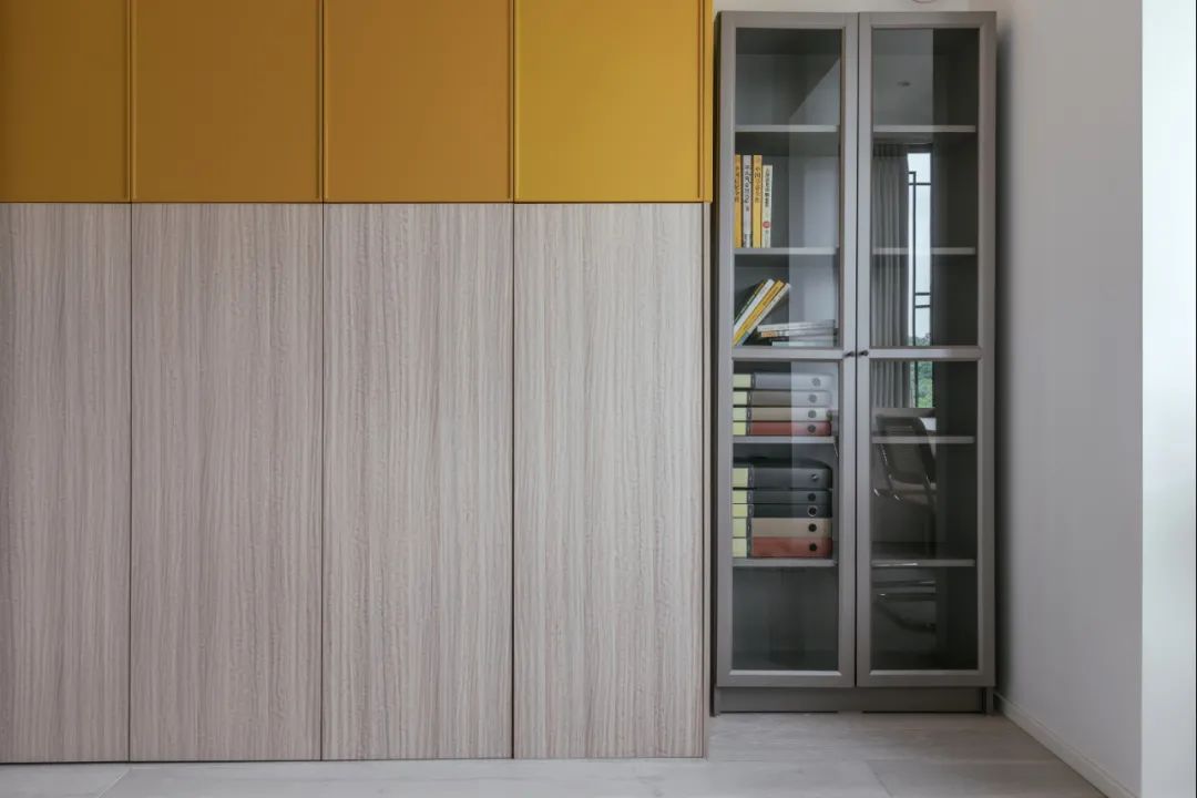 ▲书房区域加入收纳柜,柜子的顶部是黄色的柜门设计,侧边一个玻璃门的书柜,整体空间显得活跃而又实用成熟。