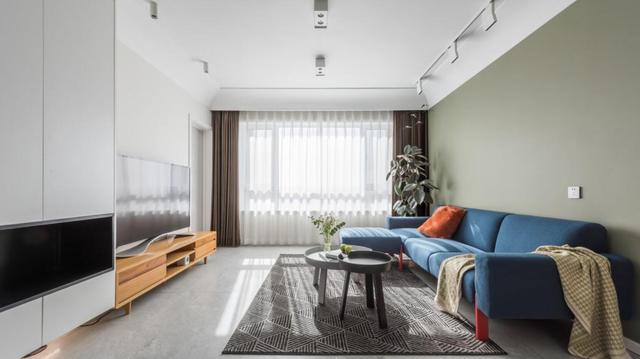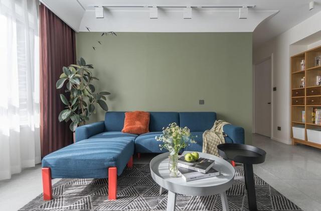 沙发墙采用去繁就简的方式,直接满刷上绿色的乳胶漆,视觉上既没有很单调,也为空间营造出了一抹清新。蓝色的沙发、绛红色的窗帘、以及绿植配置,完美提高了空间的丰富性,并做到了色彩平衡。