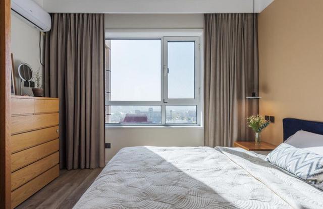 主卧以素雅为基调,土黄色的床头背景墙,搭配上两件旧床头柜,立马就使空间显得清爽多了。而将衣柜设计在电视墙处,也释放了空间的开间尺寸,让房间看起来更加的宽敞。当然,为了不浪费空间,进门转角处则配置一个挂衣架。