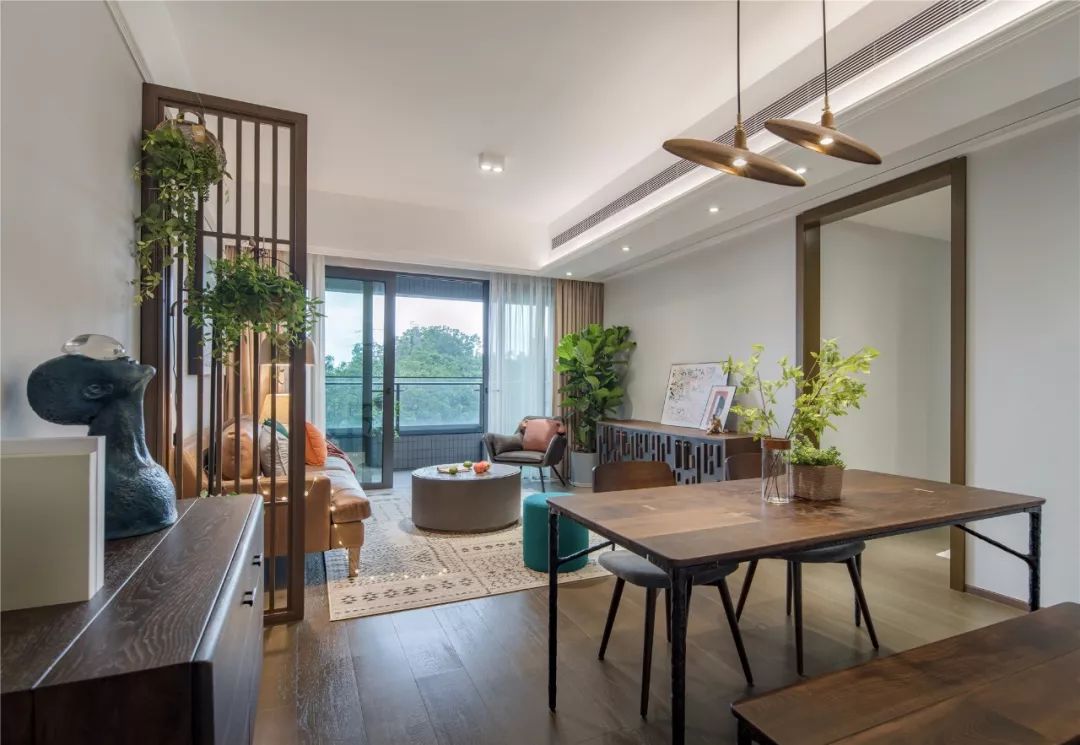 餐桌椅和餐边柜都是木质的,设计师还在沙发边上做了个木栅栏隔断,可以避免入户直视阳台的风水问题。没有摆放电视的电视背景墙靠绿植和装饰画点缀。