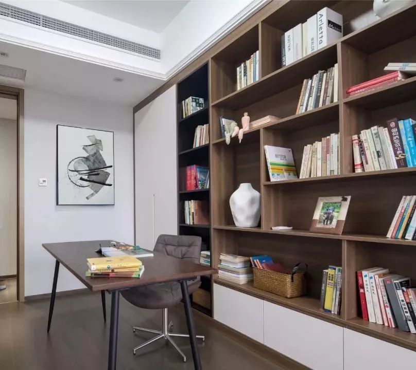 书房做了书桌加上满墙书柜的设计,如果有需要可以把在书房内布置一张床,把书房变成客房,轻便的书桌移动起来也很方便。