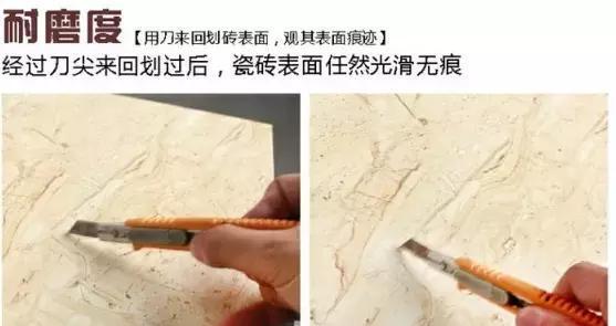 现在瓷砖不管是抛光砖、微晶石、全抛釉、仿古砖在耐磨程度上都已经达到了质的飞跃,基本你怎么去刮去划都不会有问题的,如果这都保证不了,那还是早点扔了换个砖吧!