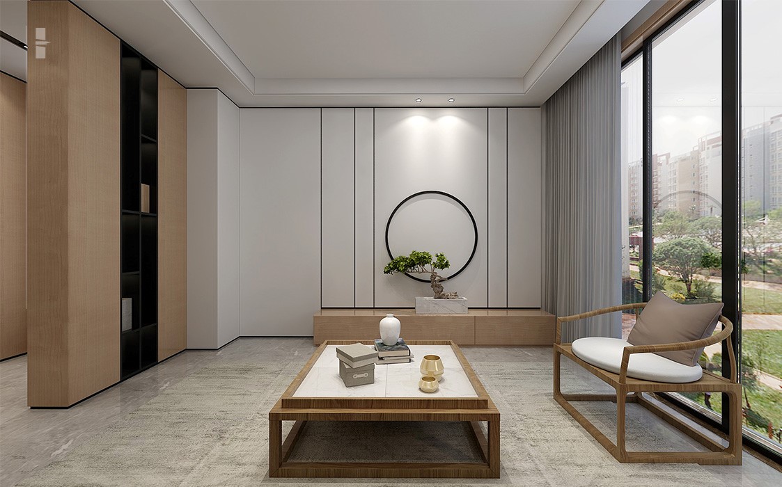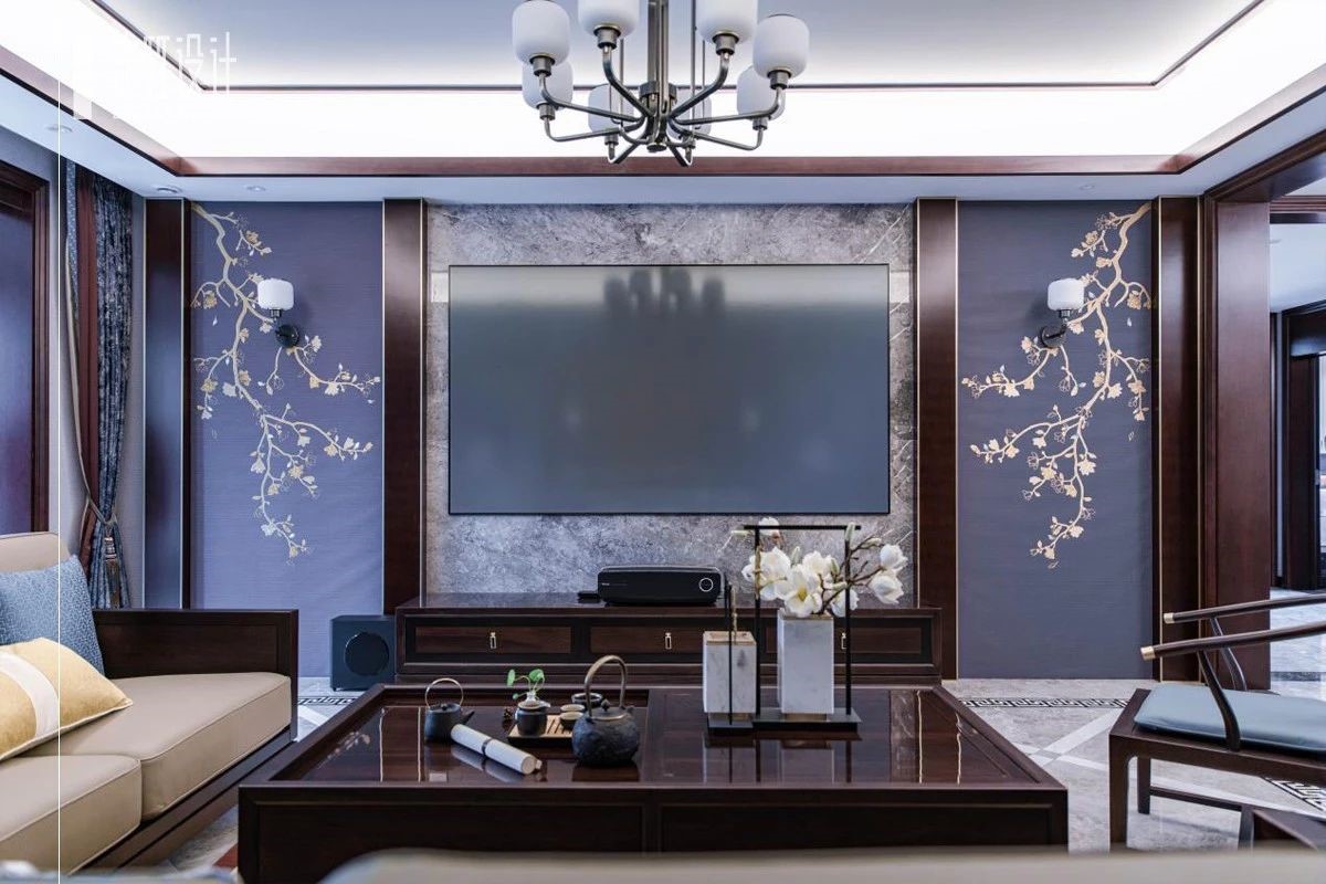 背景墙可以选择与中式相吻合的元素进行搭配,比如山水画、水墨墙纸等等。