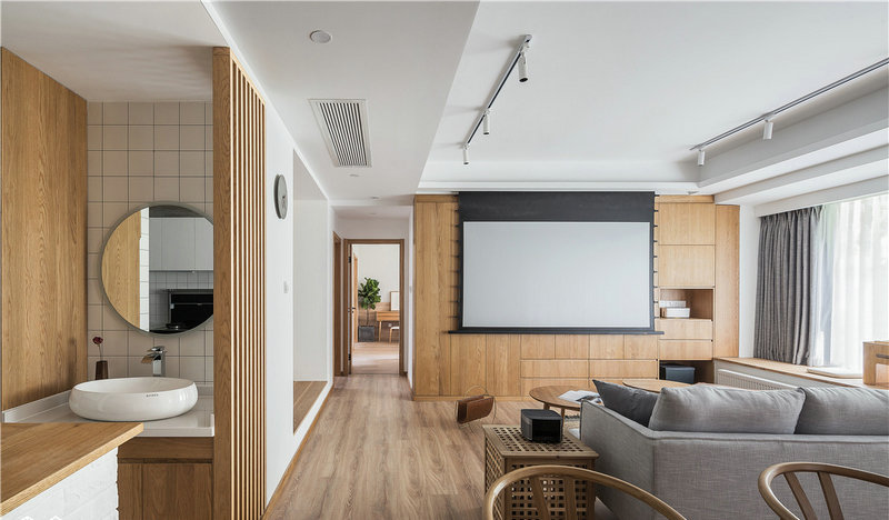 越来越多人客厅背景墙不再挂电视,用起了投影,这也是需求之一。这样背景墙作为播放的场景就不能做镂空隔断这些设计,要做平面的设计方便投影播放。当然也可以安装幕布,就没有太多限制。
