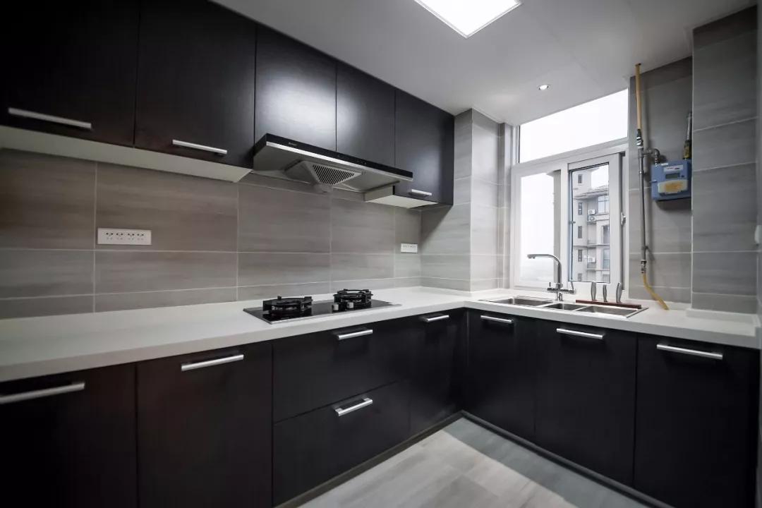 以黑色为主体的厨房橱柜,和墙地面区分开,营造出一个黑色的高级空间感,可以提高厨房的耐观性,也更不容易显脏