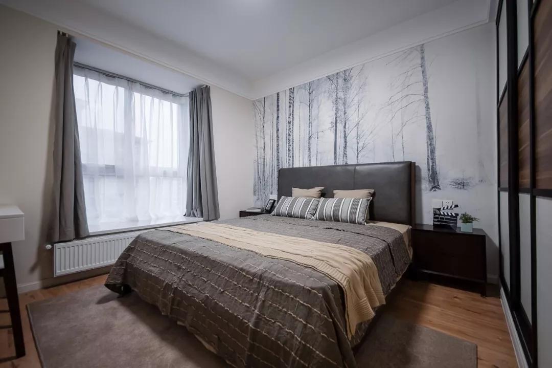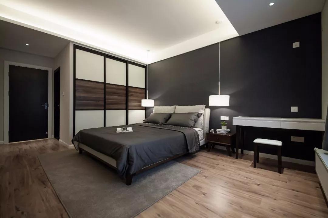 主卧可以说是非常的宽敞,嵌入式的衣柜和书桌都非常实用。黑色、灰色和原木色构成多个层次,让主卧更加时尚。