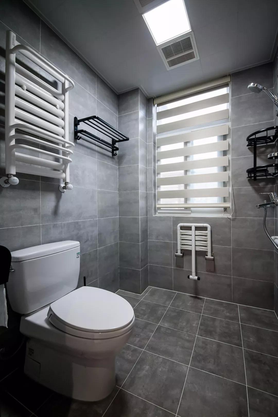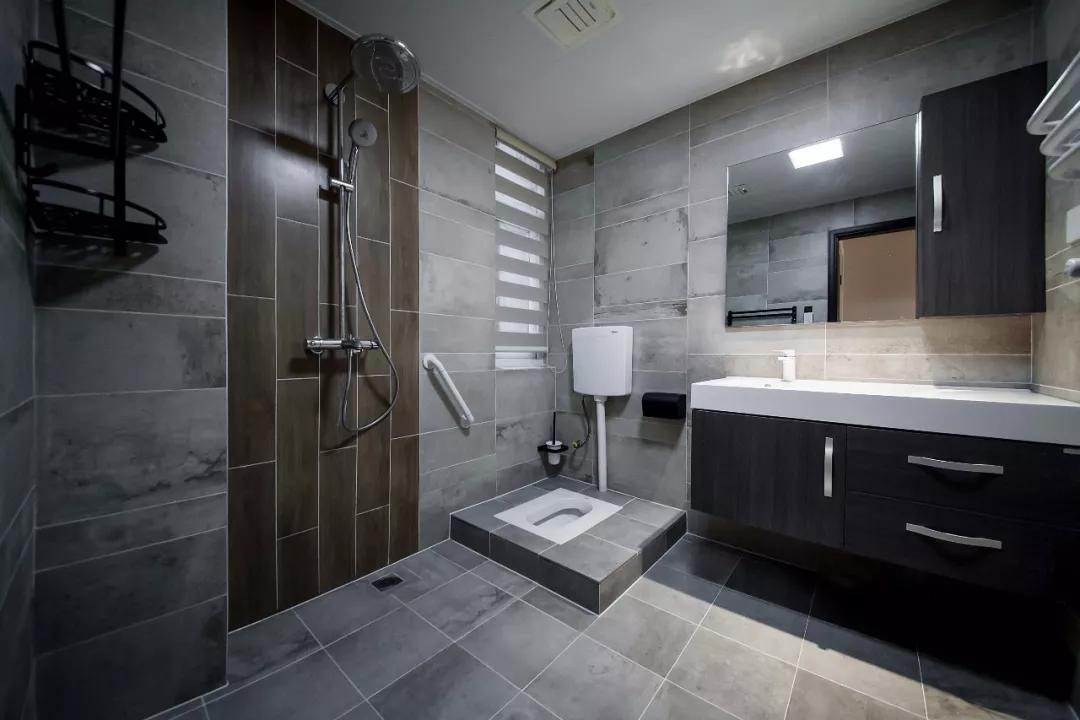 主卫没有做干湿分离,但是把蹲厕位置抬高了,也用不同的瓷砖来划分空间。蹲厕位还做了一个扶手,方便老人使用。