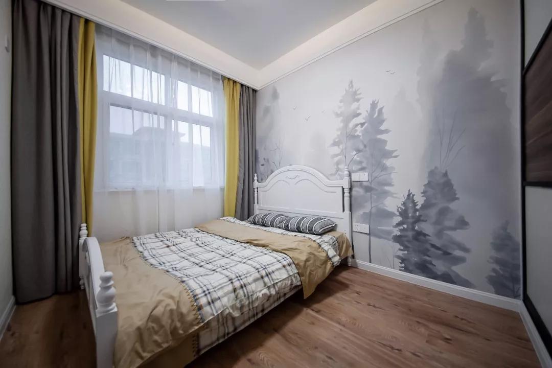 儿童房同样用了雪白+雾气杨洒的森林壁纸,把床靠着窗户摆放,这样可以留出更多的活动空间,给孩子玩耍。