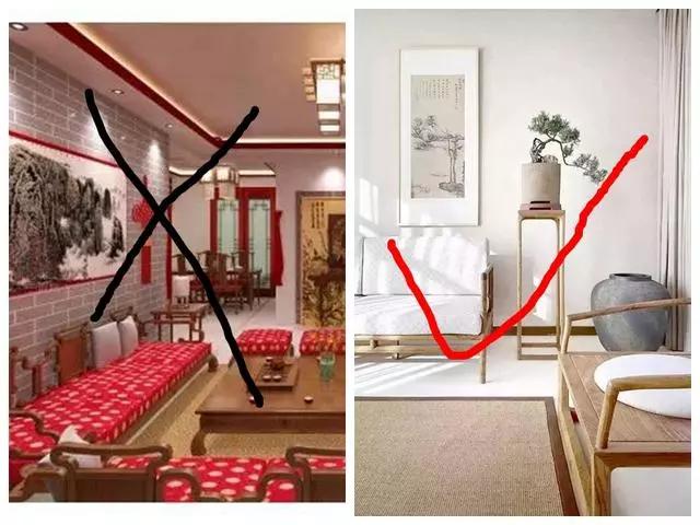 新中式并不是像这样的满目红木家具,土气的背景,夸张的色调。新中式的内涵在于以现代的元素为基底,以中式元素为点缀,传承经典的同时,又巧妙地融合了时代特性。没有太多华丽的色调、繁杂的装饰,而是重在营造简约灵动、优雅含蓄的意境。