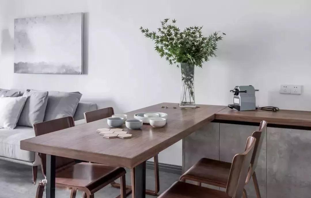 餐桌通过一个靠墙的壁柜组成L型,构成一个有方向引导的空间,尽管没有围墙但是桌子迫使人们脑补上了他们。厚实的木板桌子,是简朴的务实之选,同时也是时尚的的代言人。