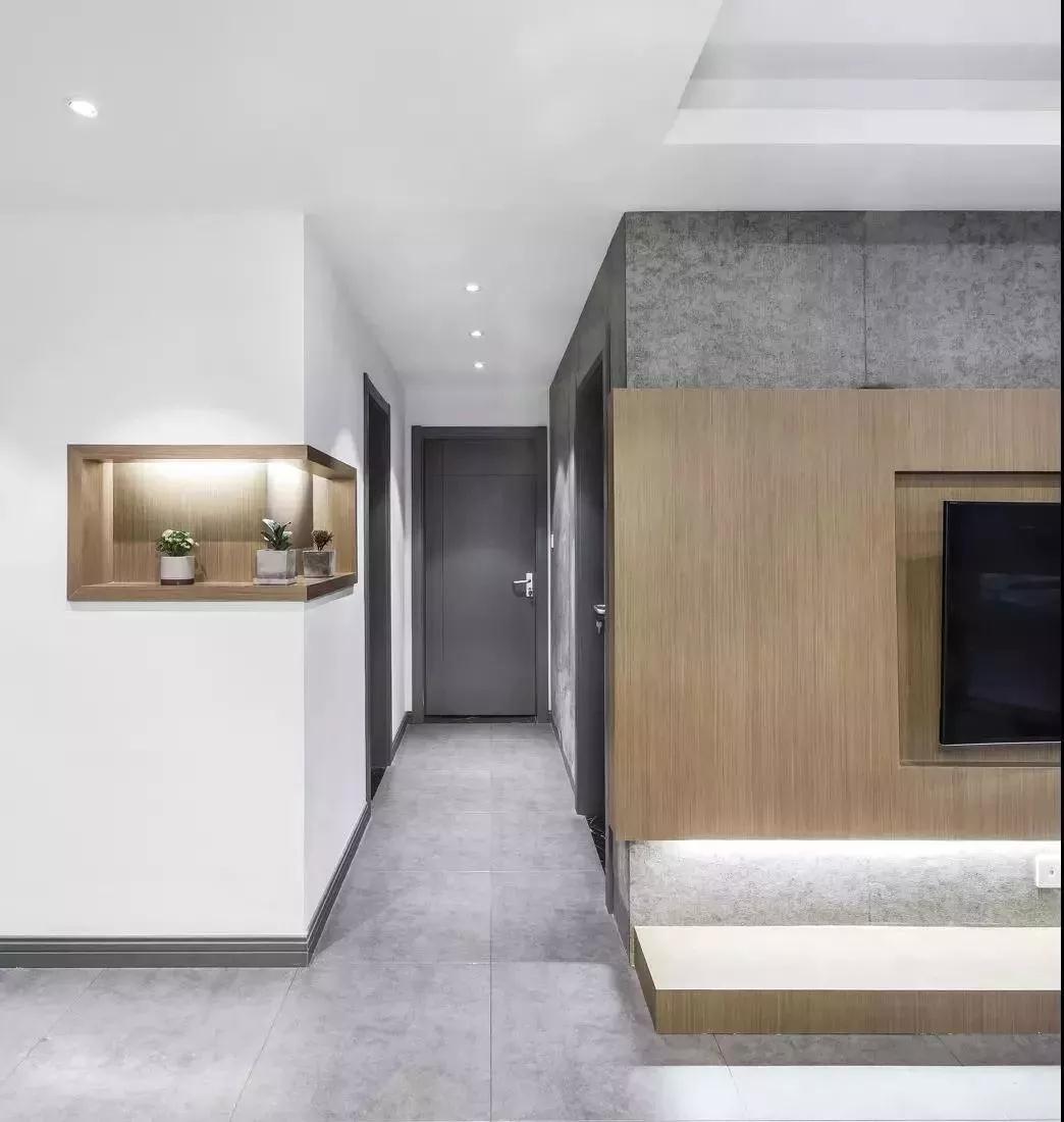 过道这里还是很有形式感的,两个门通过灰色的门框产生对比和呼应。墙角处被装了一个嵌入式的小储物柜,负责陈列摆件,这避免了让两扇白墙在这里交汇。