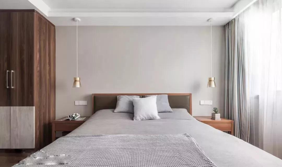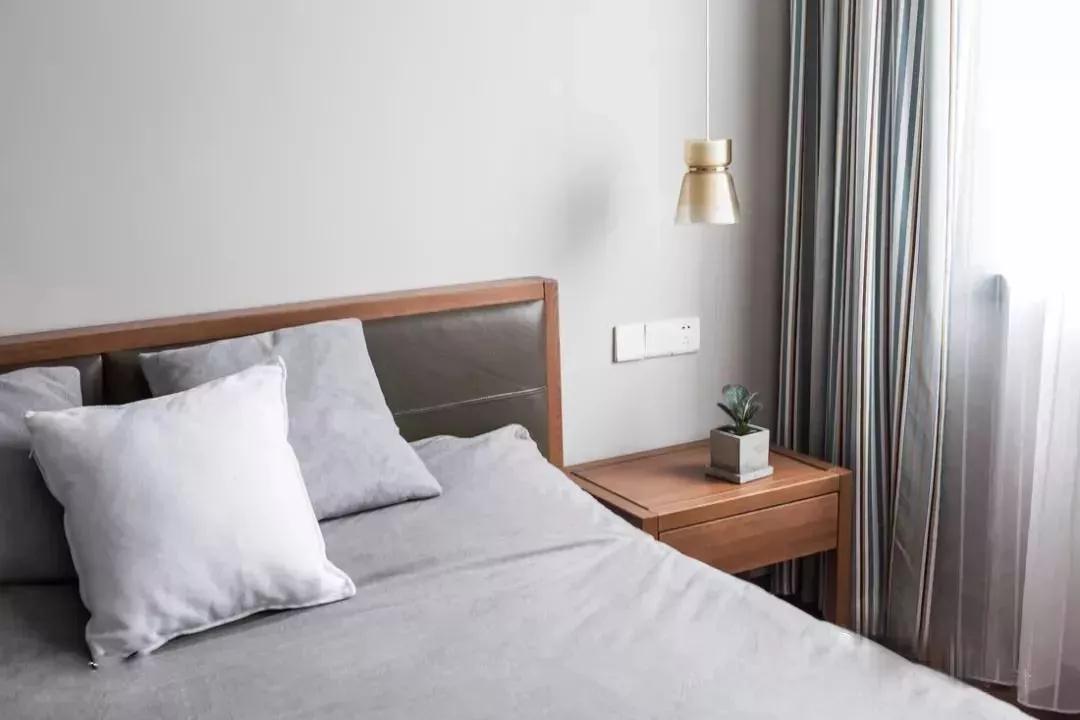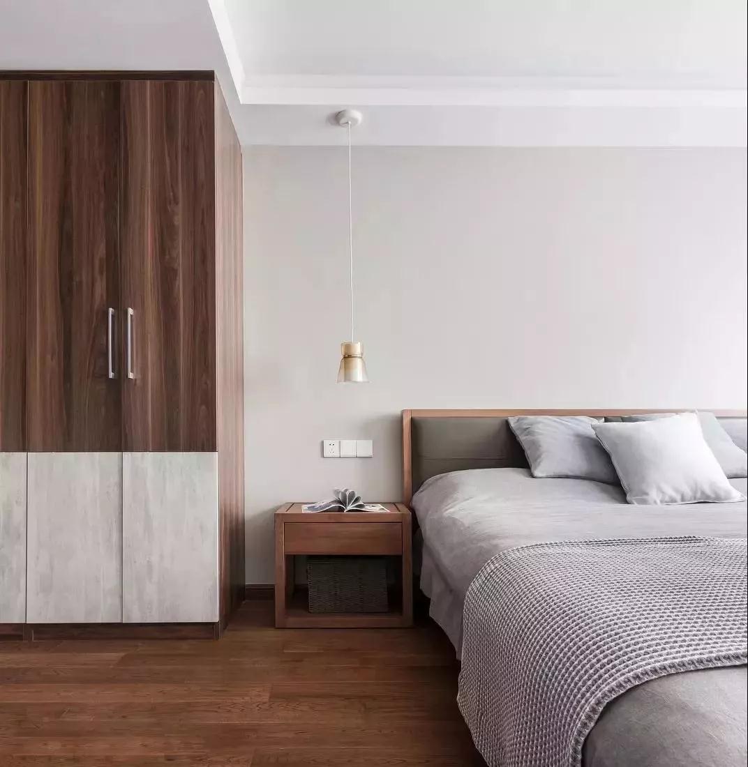 为了维护从头到尾的持重和简练,设计者在这里仍然保持克制,其实在灰色和原木色的空间里,你可以少量点缀一些鲜艳的色彩。当然家具风格界定了你能否那么做,在左侧的衣柜的对比下。