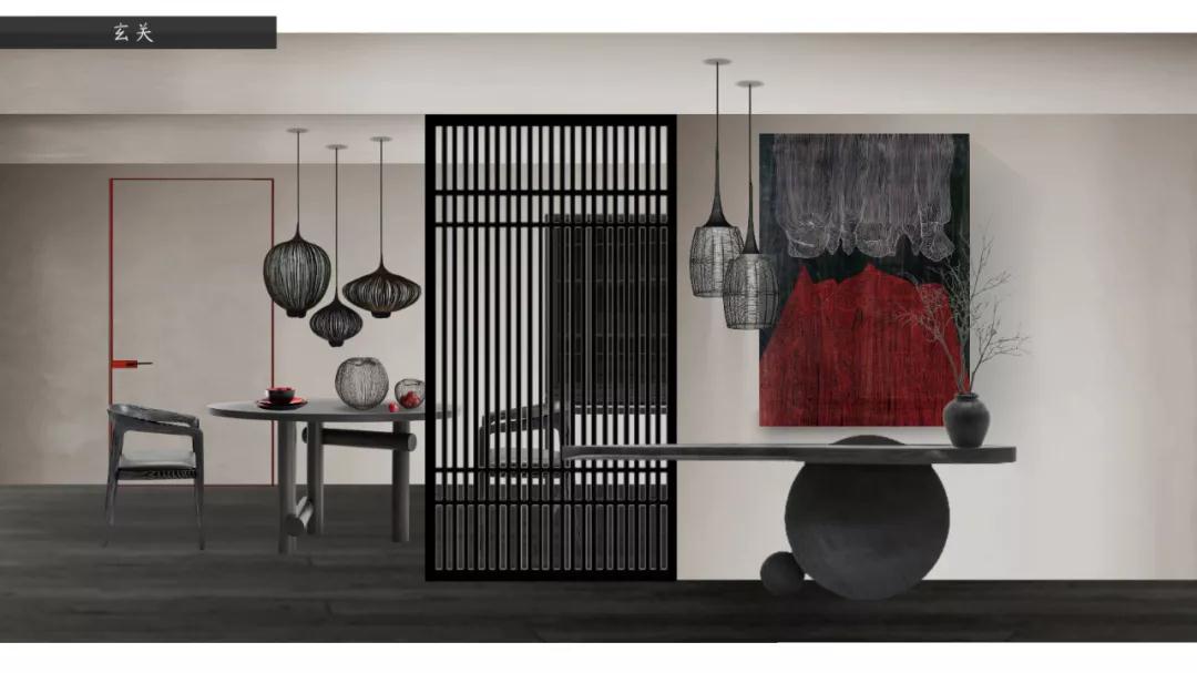 这是一个玄关与餐厅的双空间设计,整体运用黑色与高级灰作对比,局部加以红色装饰画与线条的点缀,如同传统水墨画一般,只需寥寥数笔就能赋予生机。