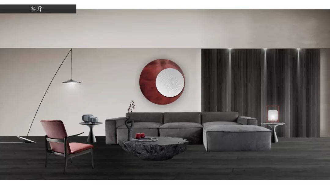 客厅整体空间以白色打底,运用了黑白灰与低饱和度红色,极简的配色彰显出低调与奢华。