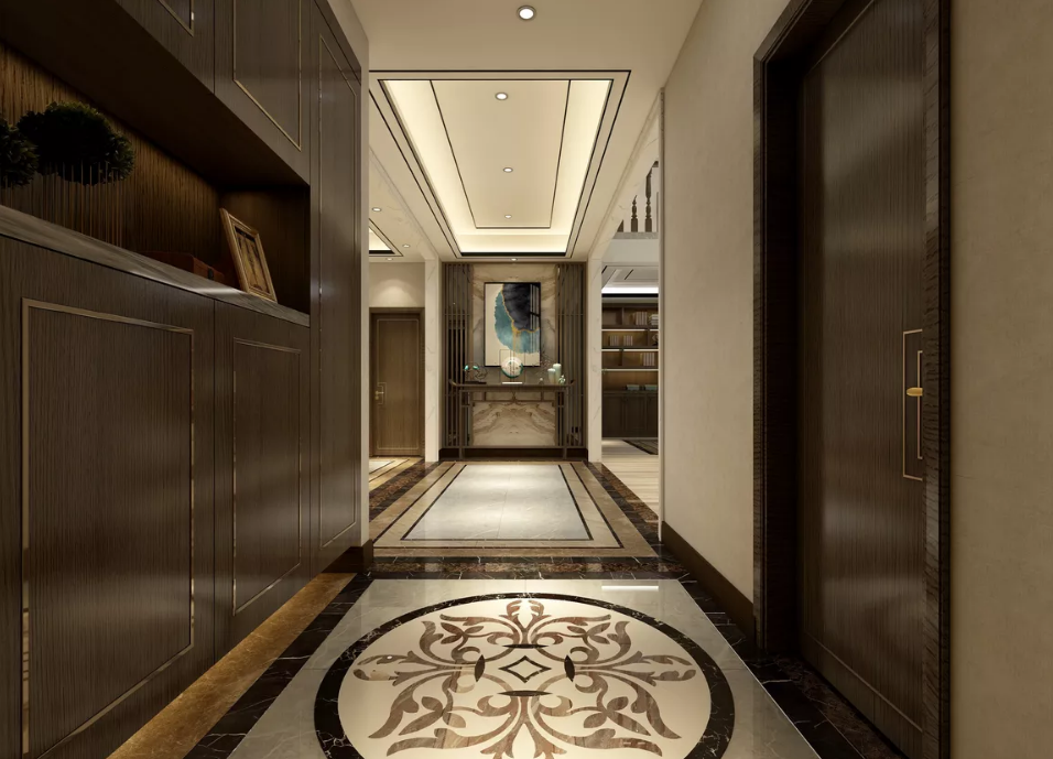 大户型中常见走廊玄关,若走廊是非承重墙,我们可以把非承重墙打掉,做一整面嵌入型柜。