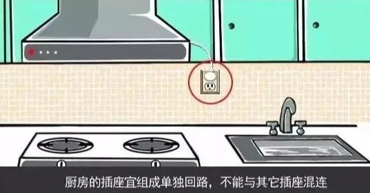 厨房内插座应为防溅插座,加上厨房使用的电器较多,微波炉、冰箱、抽油烟机等,因此,厨房的插座宜组成单独回路,不能与其它插座混连。