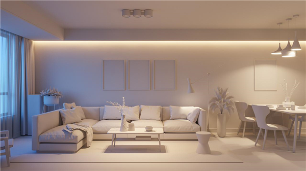 室内灯光类型主要分为3种:环境光、轮廓光和焦点光。环境光是照明范围主要的常规光源,看不清直接光源和方向,是一种柔和的光照效果;