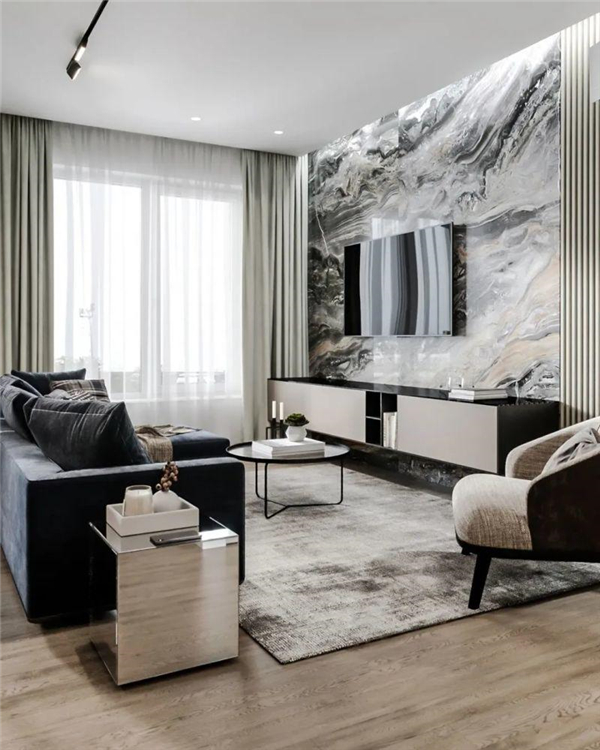 例如,射灯打在大理石墙面与打在布艺护墙板上的区别是非常明显的,前者给人以高贵轻奢的氛围感,后者则是温暖舒适的自如感~