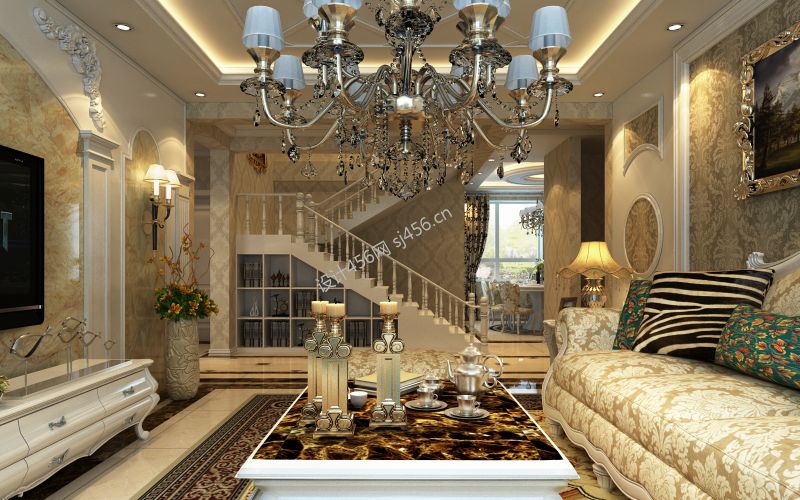 简欧风格家庭别墅客厅沙发摆放设计效果图