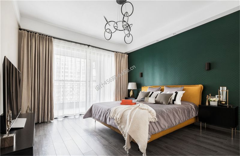 94平米现代简约三居室卧室墨绿色背景墙设计图片