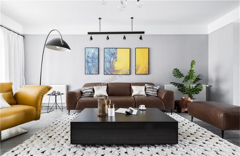 94平米现代简约三居室客厅沙发墙挂画布置图片