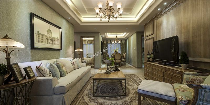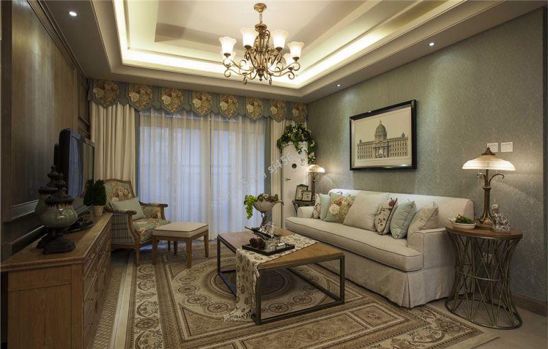 详情美式风格三居室客厅地毯铺设效果图片