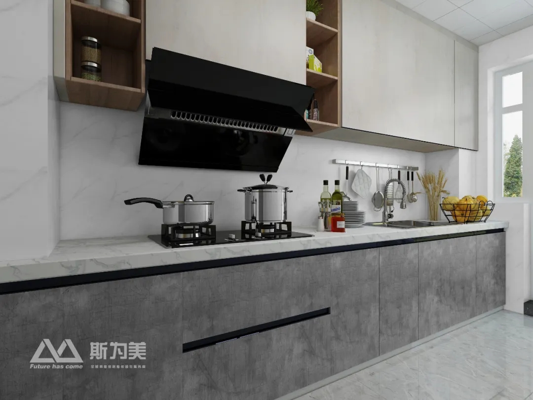 橱柜配色以灰、棕、白为主,美观同时兼顾清洁方便的功能。推开阳台的门,新鲜空气涌入,与午后的阳光交融,是这里的美丽的风景。