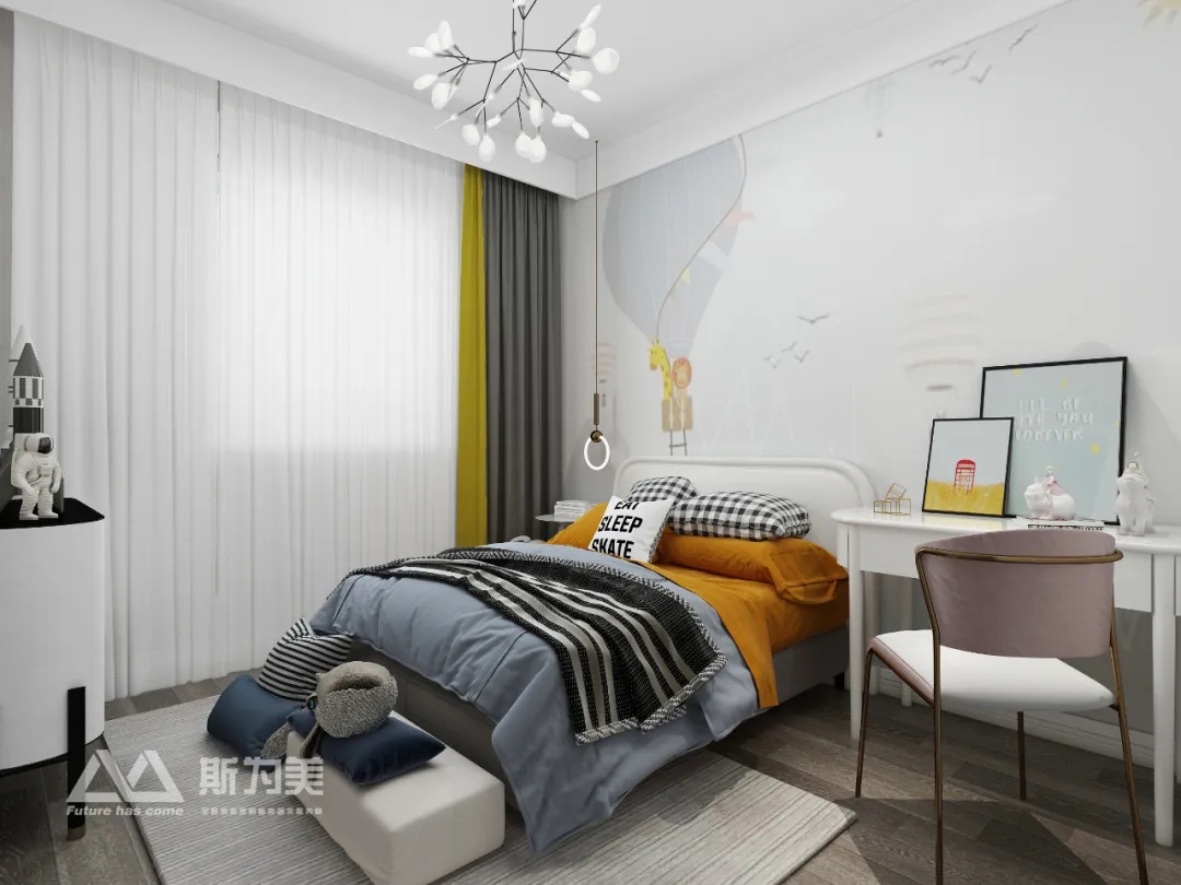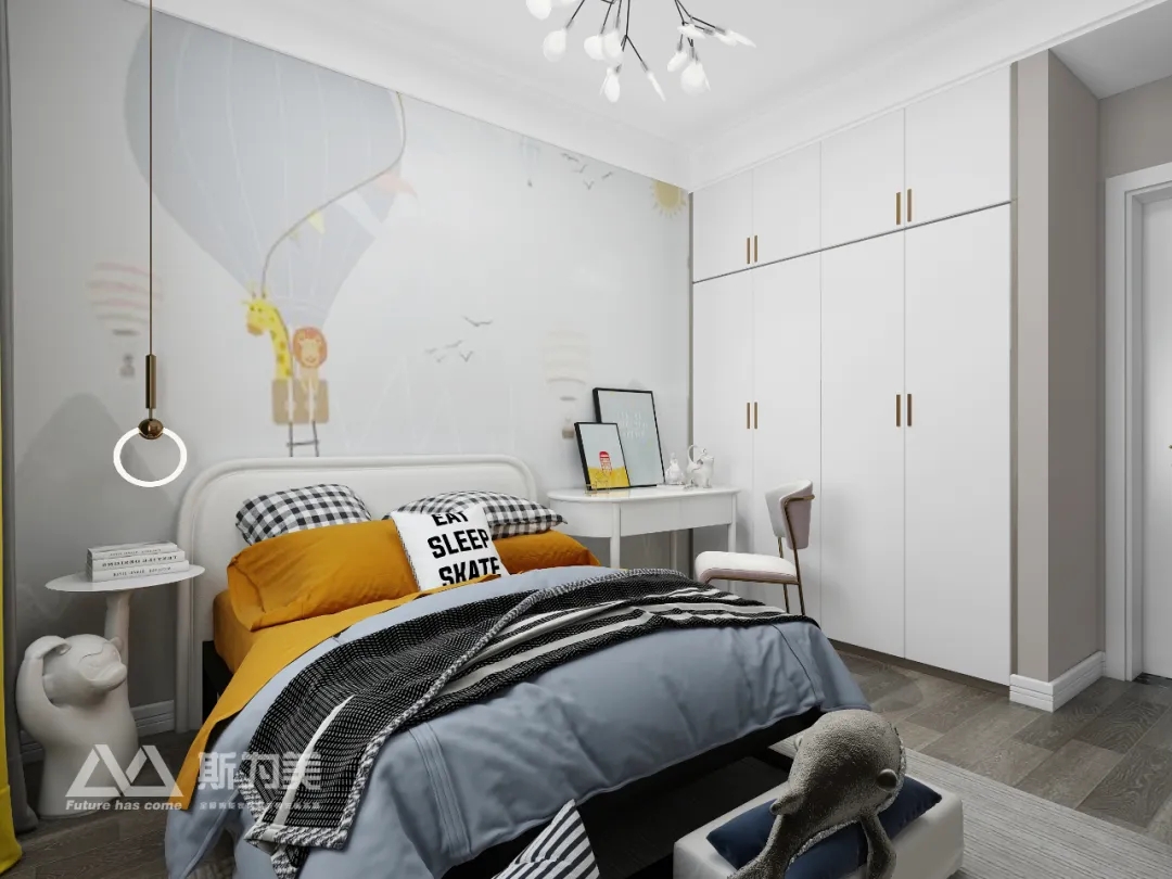 墙壁是充满童趣的壁画,坐着热气球的长颈鹿是孩子童年的美好记忆,清新的配色可以搭配一些跳色的软装配饰,是孩子喜爱的小天地。