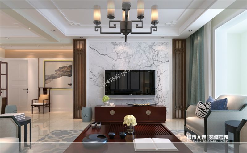 详情139平米新中式风格三居客厅电视墙家装效果图