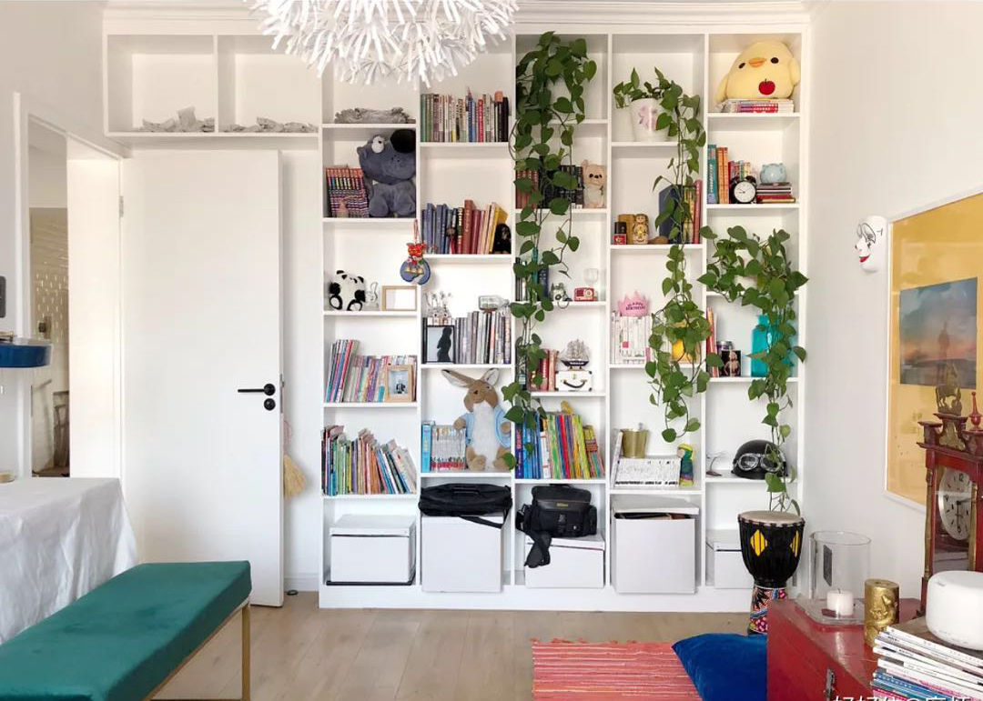 整面墙的书架不仅可以放书,还有很多空格可以放置其他物品