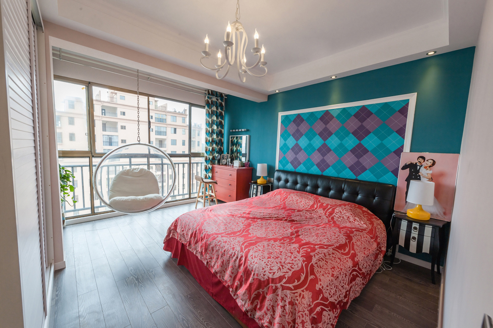 卧室更需要一定的私密性,镂空的隔断配上纱幔,使得空间多了份通透,红色灯笼吊灯借着中式之风,与床品构成和谐。