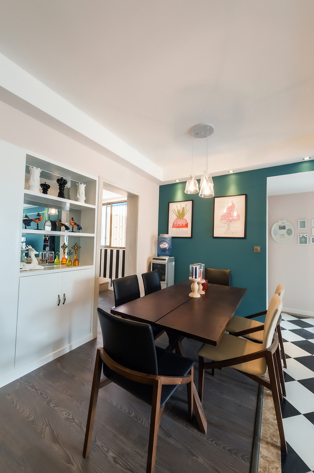 餐厅与厨房通过木质花型结构区分,暗绿色的墙面悬挂着青铜装饰品,与实木家具蕴含着天然材质的灵美;一尊佛像、一簇绿植以及一组灯笼吊灯以关联的形式,将佛教元素与自然气息结合,充满特色。