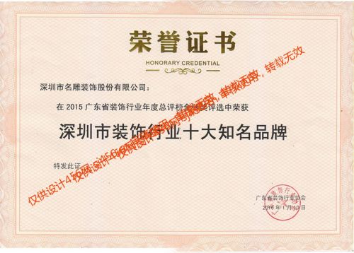 深圳市名雕装饰股份有限公司始建于1999年,2016年正式登陆A股(股票代码: 002830),成为全国仅有的两家上市家装企业之一。经过十余年的稳健发展,名雕已成为集家居设计服务、工程施工服务、公共装饰设计服务、材料物流配送、家私生产、售后服务、专业教育培训于一体的全国知名家居装饰企业。 公司主营业务是为中大户型住宅客户提供专业、高品质的一体化装饰服务,是国内知名的以设计为特色的“一体化家居解决方案”服务商。旗下共拥有名雕装饰、名雕丹迪、名雕盛邦、名雕物流配送中心、名启家私厂、名雕职业技能培训六大品牌服务机构。 总部设在深圳,并在深圳、东莞、中山、佛山等地设有30家直营装饰设计服务机构。多年来企业坚持“规范化、专业化、集团化”的发展道路,信守“忠诚、务实、沟通、稳健”的经营之道,恪守“原创设计为先”和“客户利益至上”原则,深受广大客户、政府主管部门、行业协会、媒体等社会各界的高度认可与信赖,先后荣获中国驰名商标、中国装饰行业十大品牌、国家工程设计与施工壹级资质、全国装饰优秀标兵企业、中国建筑装饰行业质量与服务诚信企业、广东省著名商标企业等众多殊荣。在装饰设计行业领先全国的深圳特区,更被誉为装饰行业第一知名品牌。