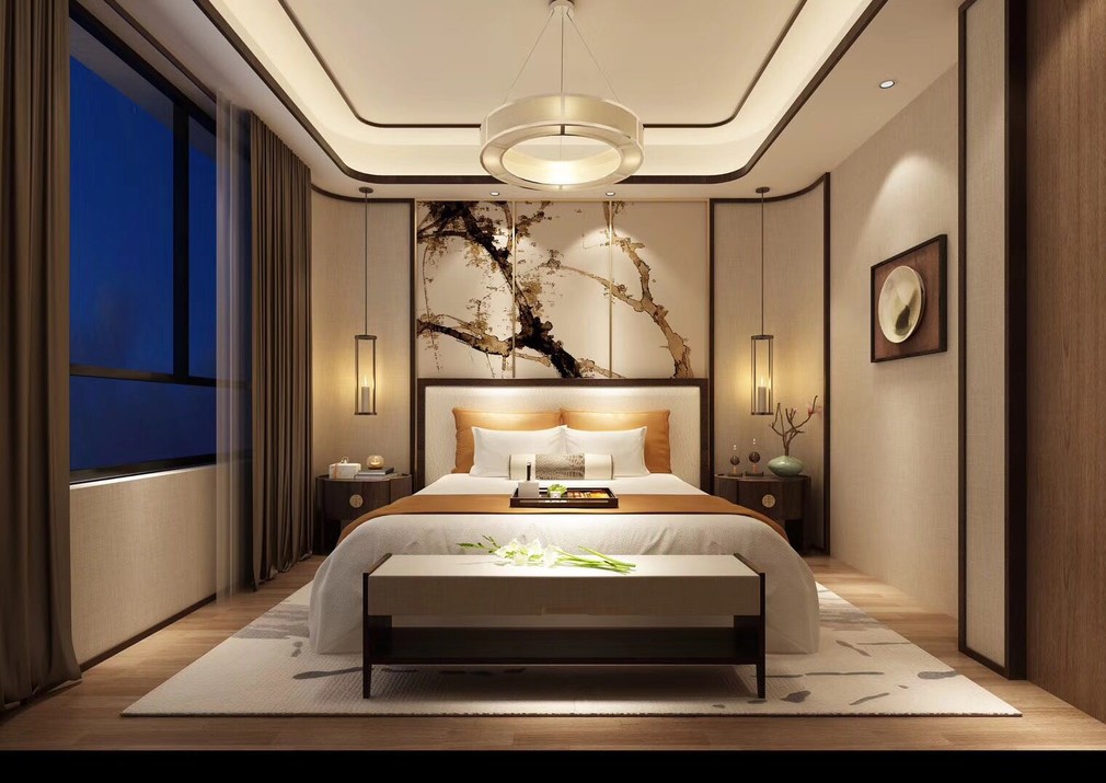 新中式风格的卧室中,能够看到较多的古典元素,比如山水画或是家具棱角的刻画,都能够看到传统风格的身影。